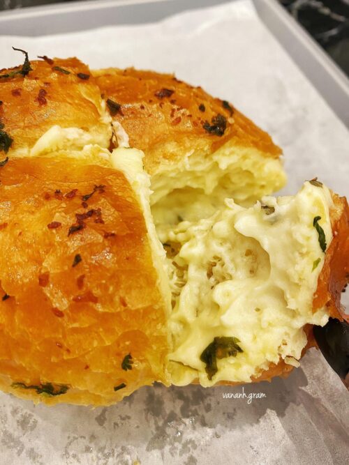 The first feeling is that these garlic bread smells so good. Try the first bite, it is tasty. However, the portion without sauce is a bit chewy, I don’t like it very much. If the bread is left to cool, the bread is still ok to eat, but not too good. However, at this price, I still appreciate the sauce inside and the aroma of this bread