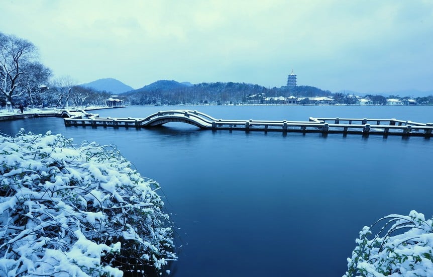 Once in a fine day after a snowfall, standing on the bridge and looking toward the northwest at the Solitary Hill and Ge Hill, one can see the hills and buildings covered with snow, and the lake and hills look crystal clear. Although the snowy beauty of the scenery is a little bit chilly and lonely, many people regard it better than noisy greens and reds in other seasons and they believe the Broken Bridge fully deserves the top position it has enjoyed for hundreds of years as the best one of the Ten Westlake Scenic Spots.