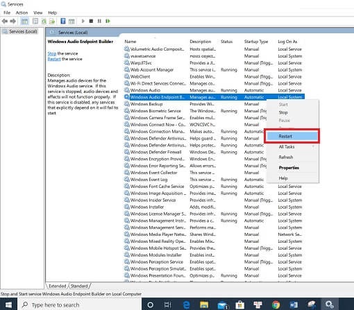 Step 4: Go back to the Service window , select Windows Audio Endpoint Builder and click Restart.