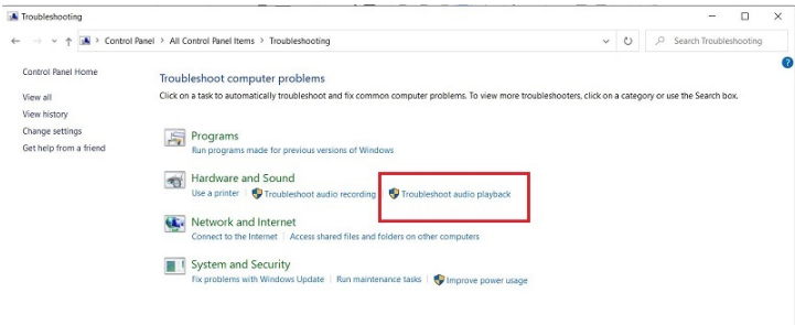 Step 2: Select Troubleshooting, a window appears, select Troubleshoot Audio Playback.