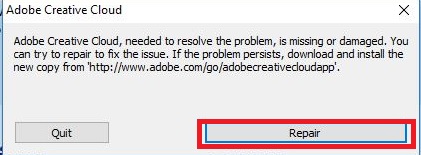 Adobe Creative Cloud, needed to resolve the problem, is missing or damaged. You can try to repair to fix the issue. If the problem persists, download and install the new copy from http://www.adobe.com/go/adobecreativecloudapp.