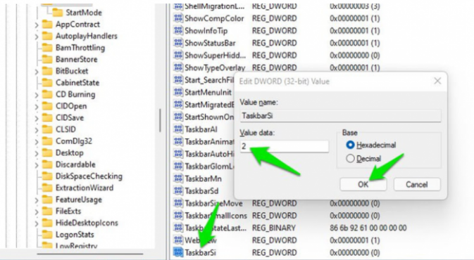 - In the Value Data field , enter 0 if you want the taskbar to be smaller and 2 if you want the taskbar to be larger ( 1 is the default option).