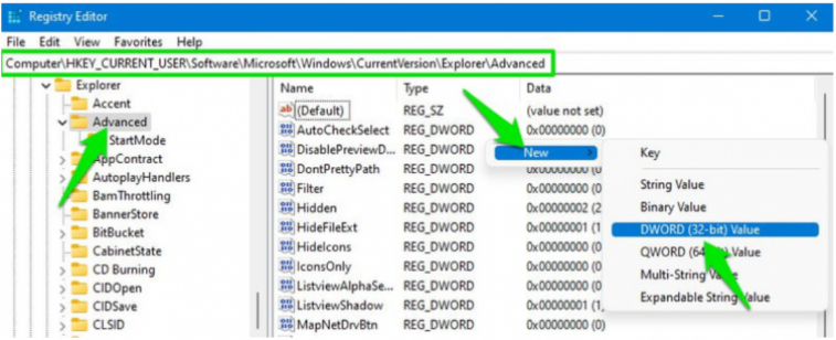 HKEY_CURRENT_USERSoftwareMicrosoftWindowsCurrentVersionExplorerAdvanced - Right click in the empty space and select New => DWORD (32-bit) Value . A new entry will be added at the end of the Advanced folder .