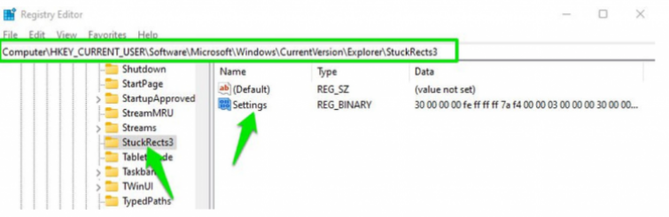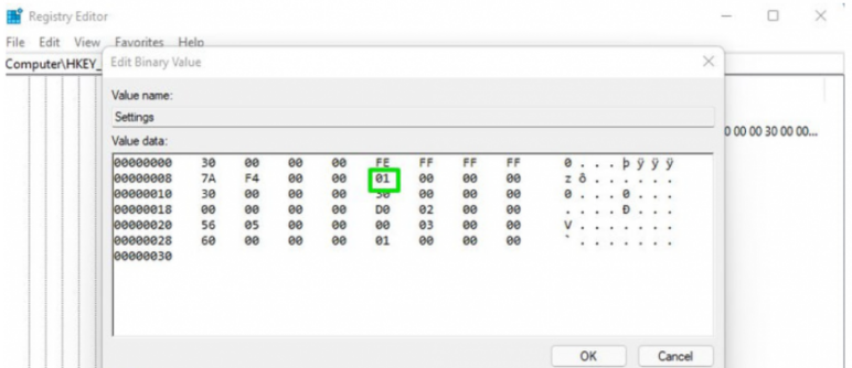HKEY_CURRENT_USERSoftwareMicrosoftWindowsCurrentVersionExplorerStuckRects3 - In the StuckRects3 folder , double-click the Settings file . This will open the “ Edit Binary Value ” window, you will see a table filled with values.
