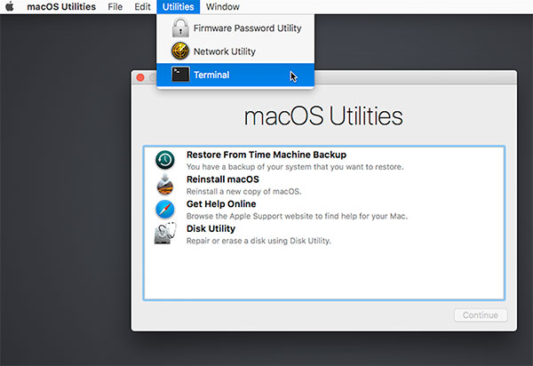 - Step 2: In Recovery Mode, select Utilities => Select Terminal
