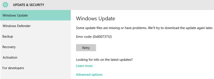 Some update files are missing or have problems. We’ll try to download the update again later. Error code: (0x80073712)