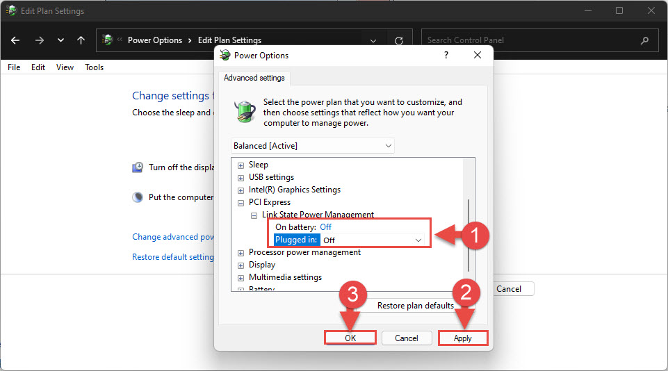 expand Link State Power Management - Now select Off from the drop-down menu in front of On battery and Plugged in. Then click Apply and Ok.