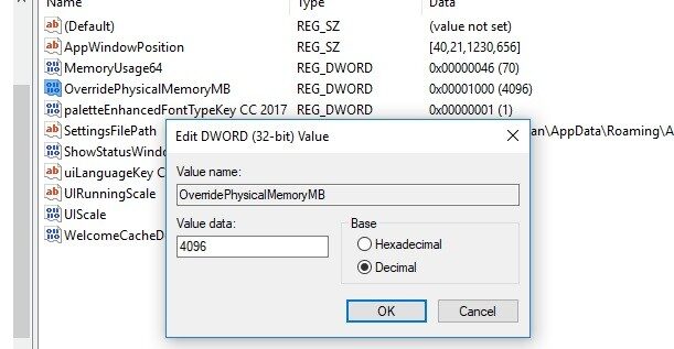 Go to Regedit by pressing Windows + R > Go to the path \HKEY_CURRENT_USER\Software\Adobe\Photoshop\120.0 > Go to 120.0 and create a new DWORD > Rename the DWORD value to “ OverridePhysicalMemoryMB ” > Change “ Hexadecimal ” to “ Decimal ” > Enter decimal value equal to your computer’s RAM value> OK .