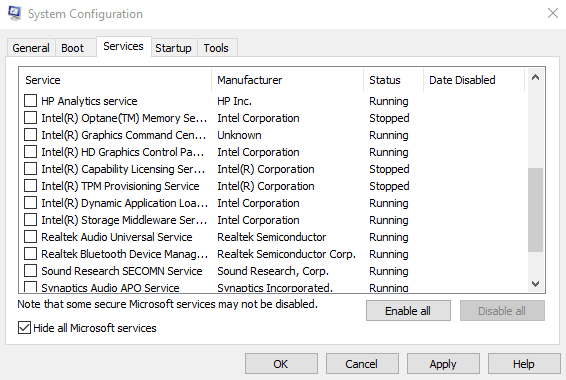 - Tick the checkbox next to Hide all Microsoft services and press Disable all .
