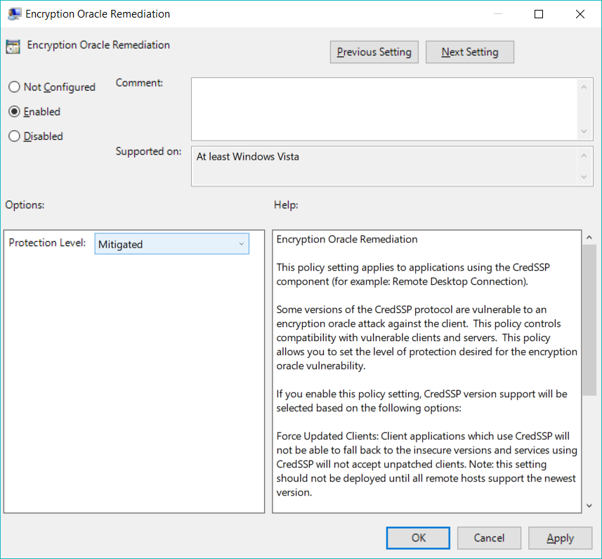 Double-click the line “Encryption Oracle Remediation”. Set it to Enabled with Protection Level = “Mitigated”: