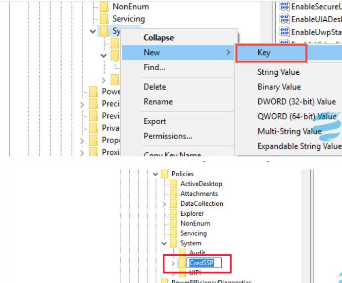 3. If a CredSSP key doesn’t exist, right-click on System, select New > Key, and name it CredSSP.