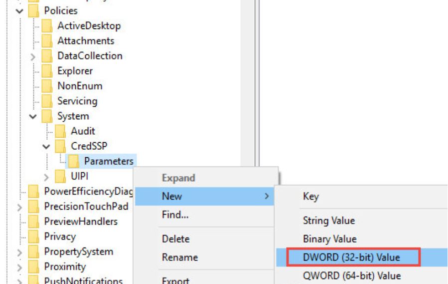 Run “regedit.exe” and go to HKEY_LOCAL_MACHINE\SOFTWARE\Microsoft\Windows\CurrentVersion\Policies\System\CredSSP\Parameters