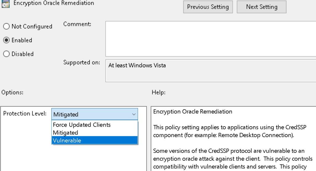 The best way to handle it is to update the new patch related to CredSSP on Windows Server and RDP Client. But if you want to be able to connect Remote Desktop to a Windows Server server that has not updated the CredSSP vulnerability patch, then on the Windows Client computer you can use the policy to lower the application protection level (policy). ) ‘Encryption Oracle Remediation’ downgrades to ‘Vulnerable’ through Group Policy.