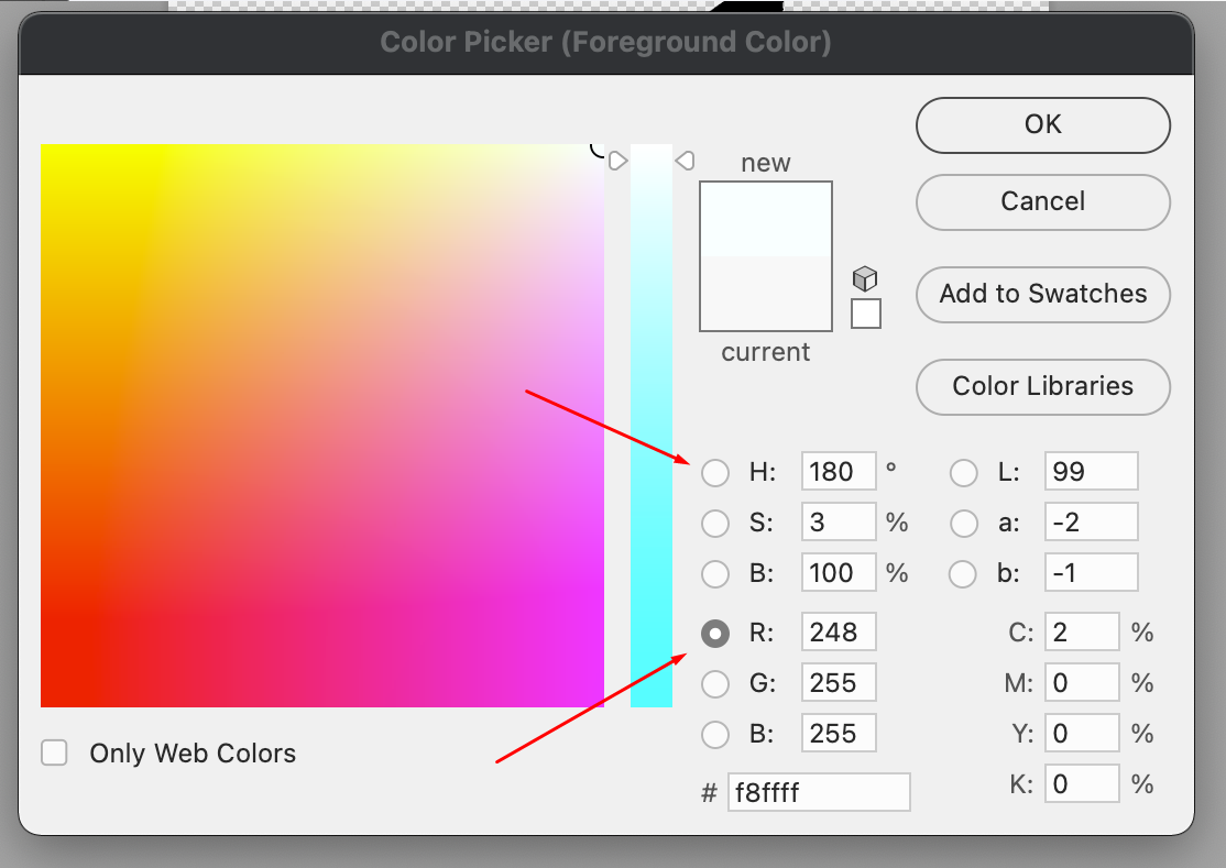 The first thing you need to know is how to access the color picker. Either clicking the foreground/background color swatches, which are located on the bottom left of your screen in the tool panel by default, or creating a “solid color” adjustment layer will bring up the color picker.