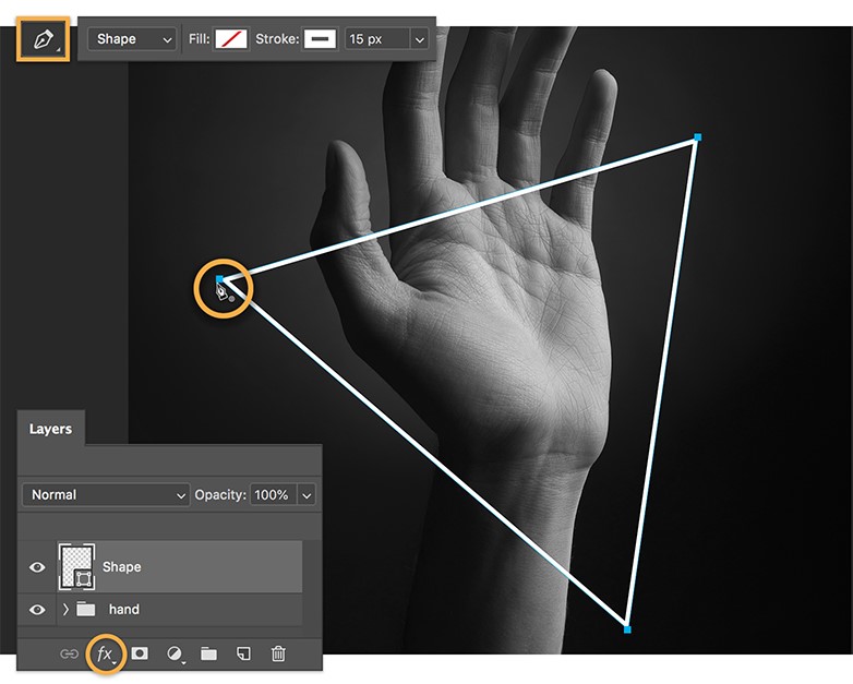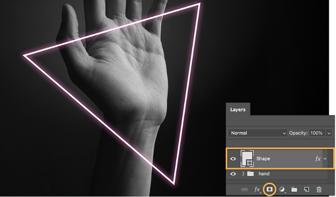 Larson wanted to hide the triangle just behind the wrist. To hide parts of your neon shape, set the Brush tool to black, select the mask (the white icon on the layer), and brush to remove those sections. To reverse the effect, simply change the brush color to white and paint on the mask to reveal detail again.