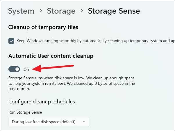 Turn on the switch for ‘Automatic User content cleanup’. You can also enable the toggle for ‘Storage Sense’ first and then click on it to configure the rest of the settings.