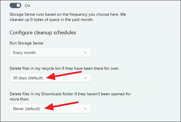 Then decide how often you want Storage Sense to delete files from the recycle bin and whether you want it to delete files from the downloads folder. If you want, you can choose the time period accordingly.