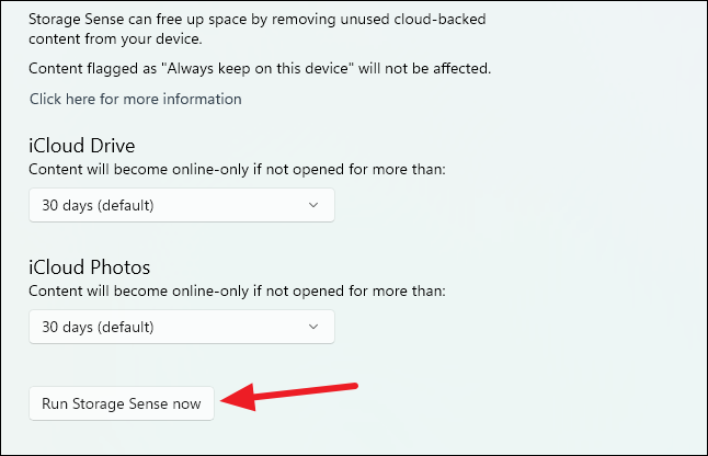 Storage Sense will run according to the scheduling configuration. If you want, you can also click the ‘Run Storage Sense’ button at the bottom to run it right after.