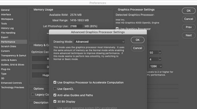 – Graphics Processor Settings (graphics processing settings): check the Use Graphics Processor option to allow Photoshop to use the graphics processor as well as the CPU. In the Advanced Settings section , you can choose 1 of 3 levels: Basic , Normal or Advanced .