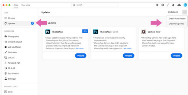 To do this, open the Photoshop application, then go to Help => Updates to open the Creative Cloud application. Or the fastest way is to open the Creative Cloud app directly. Next find and click Updates on the sidebar. Click on the 3-dot icon in the top right corner, select Check for Updates.