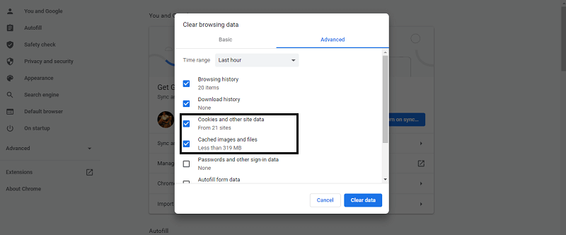 Here, Windows under the advanced tab will show many boxes but you will have to select two of them: a) Cookies and other data, b) Cached images and files.
