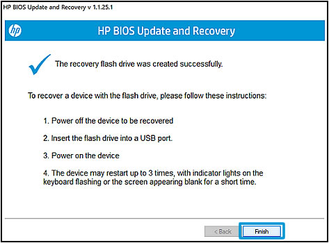 When the successfully created BIOS recovery USB drive displays, click Finish.