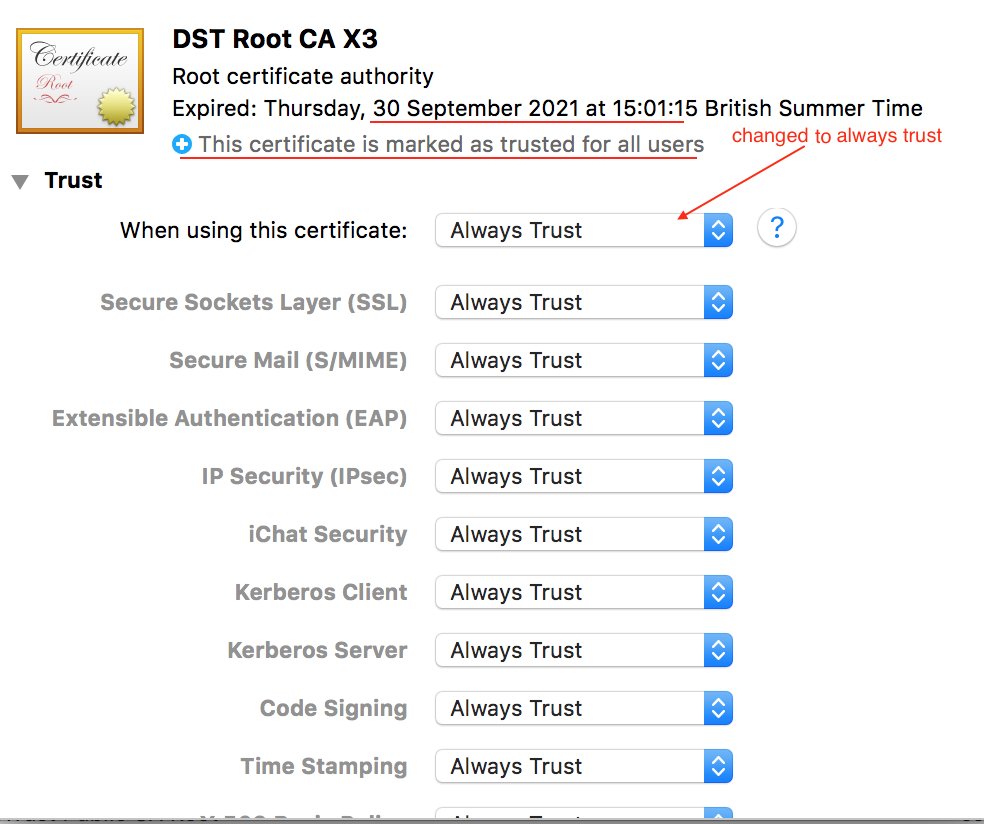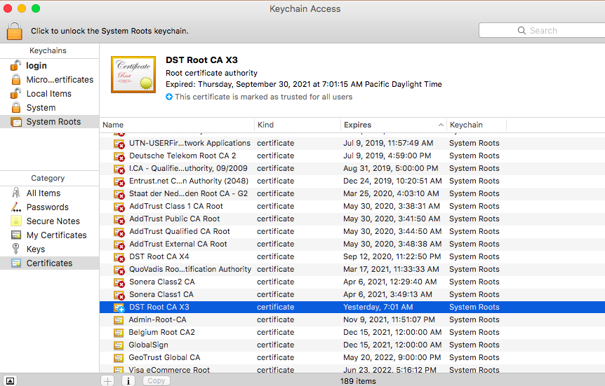 In my case, I saw DST Root CA X3 file was the one. I clicked the file and clicked again ” Trust “