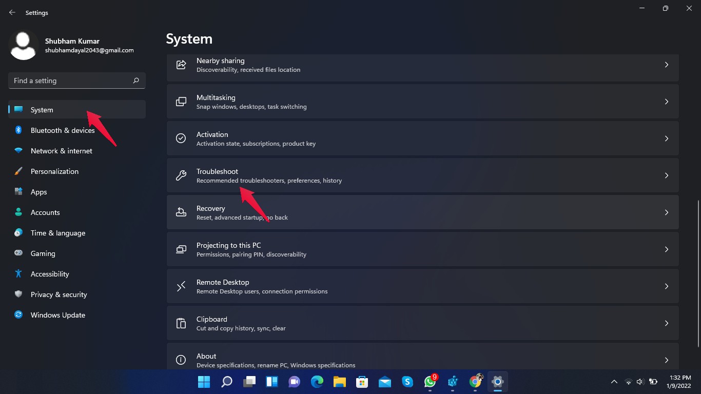 - Click on System, scroll down and click Troubleshoot in the right pane.