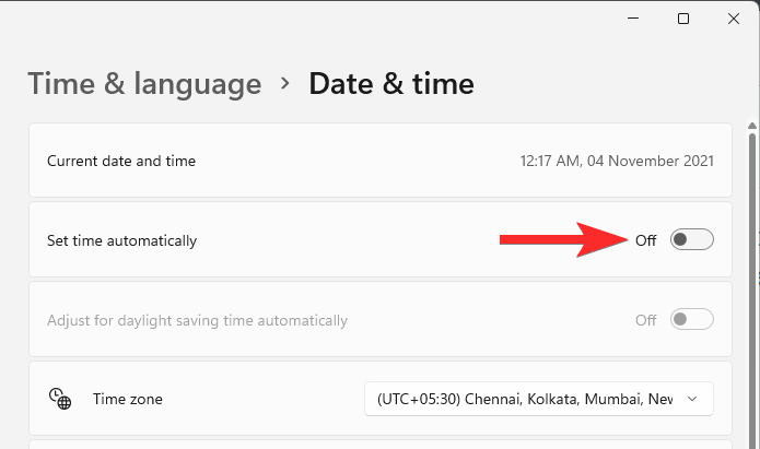 In the ‘Set time automatically’ option, click the toggle on the right to disable it.