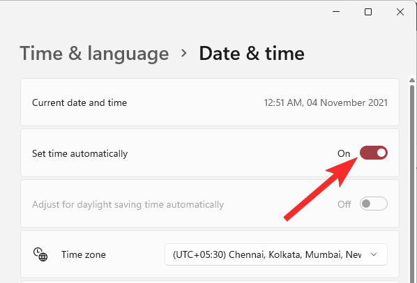 In the ‘Set time automatically’ option, click the toggle on the right to enable it.