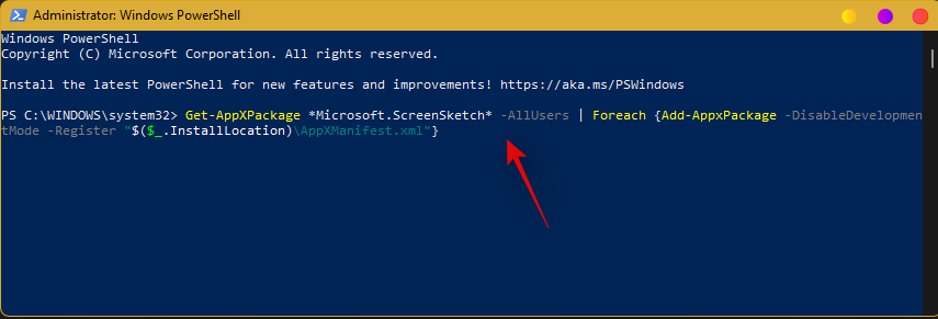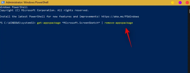 The Snipping Tool will now be removed from the PC. We recommend restarting your PC at this point. After rebooting, relaunch PowerShell as administrator and execute the following command.