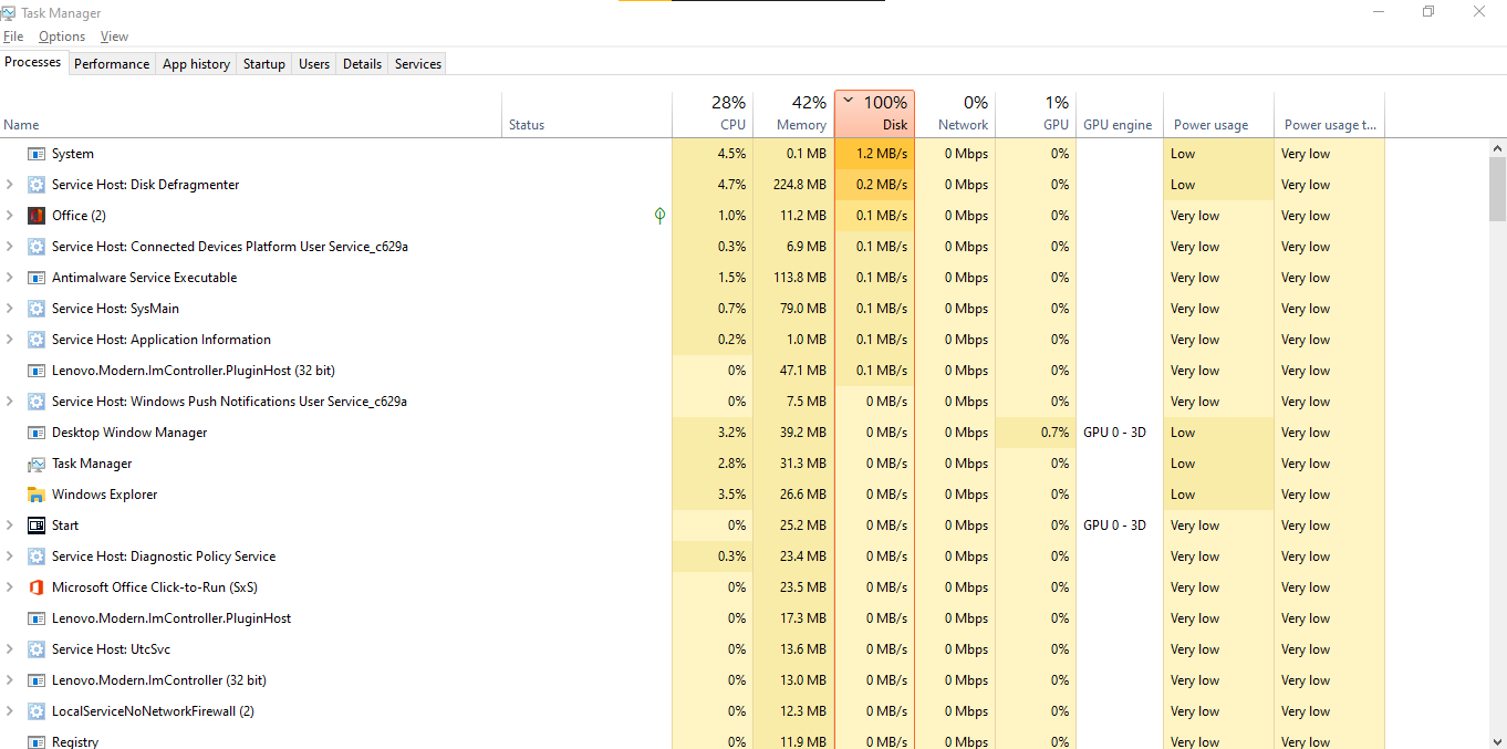 I am using Lenovo G-5080 with Windows 10 OS Build 19042.870. As the subject suggests disk usage is high at PC boot-up after the updates mentioned in the pic 1,2,3 from windows update are installed. By looking in the task manager, the System and Services host consumes the most of the disk space. The System Interrupts consumes 100% of the CPU after boot-up causing the slow down the PC. None of the application is opened during this process. All the Startup applications are disabled. The Laptop heats up during this.
