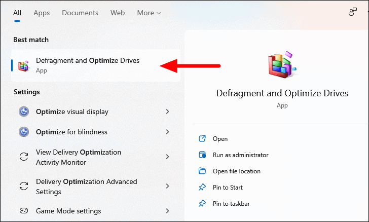 To defragment the hard drive, search for ‘Defragment and Optimize Drives’ in the ‘Search’ menu and click on the relevant search result to launch the application.