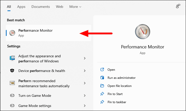 To run the Performance Monitor app, press WINDOWS+ S to launch the ‘Search’ menu, type ‘Performance Monitor,’ in the text field at the top and click on the relevant search result to launch the app .