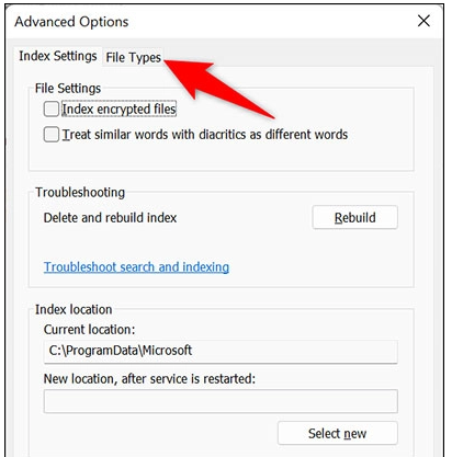 In the “Advanced Options” window , click the “File Types” tab.