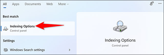 To specify the file type to hide, first open the “Start” menu and search for the keyword “Indexing Options”. Then, click on the corresponding option that appears in the returned results.