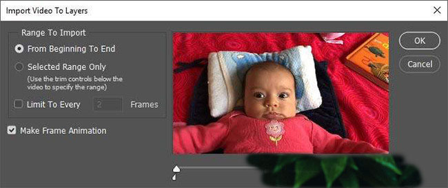 Finally, check the Make Frame Animation box. Click OK and your video will be imported as a series of frames in Photoshop. If the program crashes, you may need to reduce the quality of the video further before trying to import again.