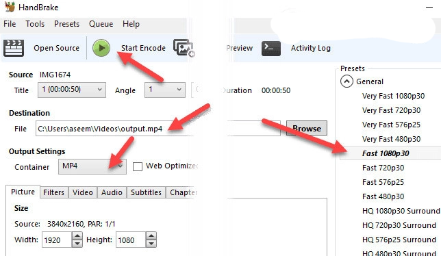 HandBrake is very easy to use. Just click File – Choose Source and select your video file. At this point, all you really have to do is click the Start Encode button. By default, it will use the Fast 1080p30 preset you see listed on the right. There are many presets, so you have to choose one of them. Note that you can reduce the resolution of the GIF in Photoshop later, so you don’t have to do it in HandBrake.