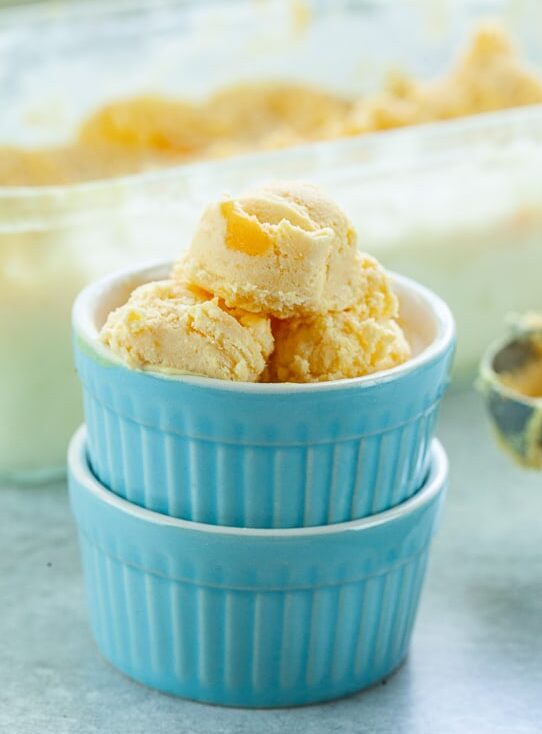 Mango ice cream made with only three or four ingredients and no churn or ice maker needed! Rich, silky, and with intense mango flavor, it’s the perfect year-round treat!