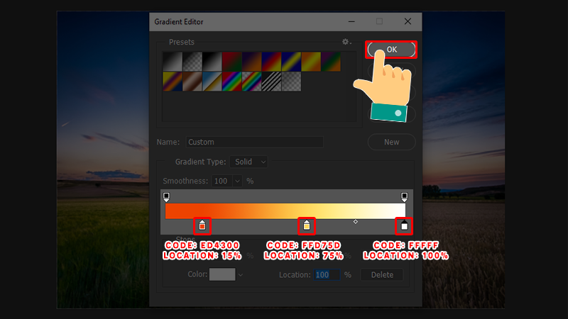 Step 6:  You can refer to how to choose colors and arrange them as shown ( Color code  in order from left to right: ed4300, ffd75d, ffffff). After adjusting the color to your liking, click OK .