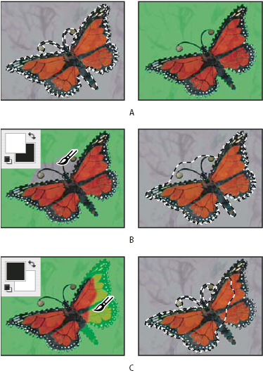 Painting in Quick Mask mode A. Original selection and Quick Mask mode with green chosen as mask color B. Painting with white in Quick Mask mode adds to the selection C. Painting with black in Quick Mask mode subtracts from the selection