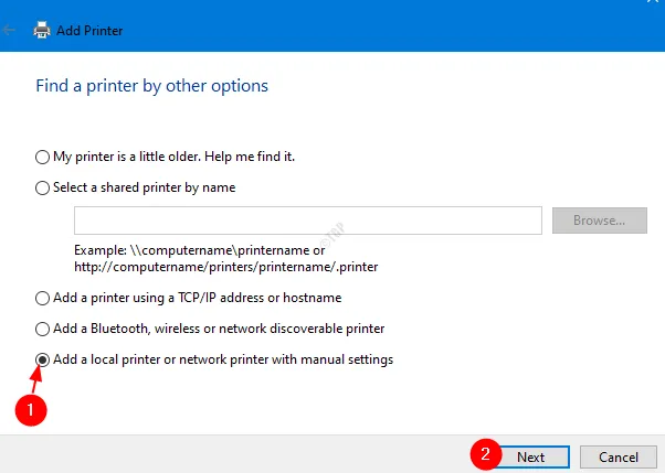 Step 9: Click Add a local printer or network printer with manual settings and click Next