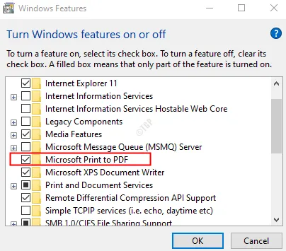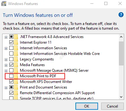 Step 5: In Windows Features window, Now check Microsoft Print to PDF option back again and click OK