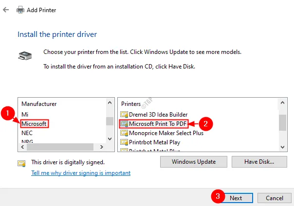 Step 11: From the Manufacturer list, select Microsoft. From Printers select Microsoft Print To PDF. Click Next