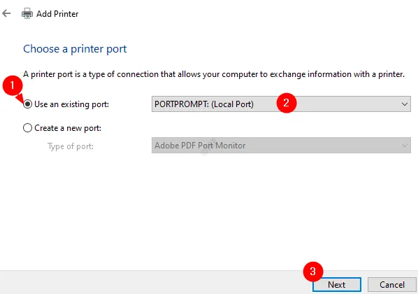 Step 10: Tick Use an existing port and select PORTPROMPT: (Local Port) from the drop-down menu