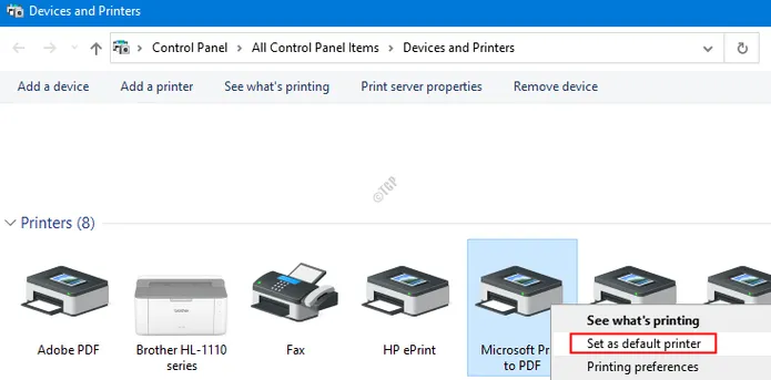 Step 4: Right-click on Microsoft Print to PDF and select Set as default printer