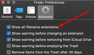 If you want to show the extensions for all of your files, launch Finder, and click on Preferences. Then go to the Advanced tab and tick the “Show all filename extensions” checkbox.