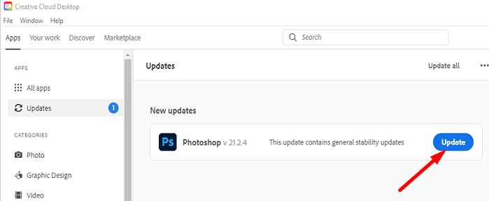 Update Photoshop and your OS to the latest version. Click on the Help menu and select Updates. The Adobe Creative Cloud App will launch. Simply hit the Update button to install the latest updates.