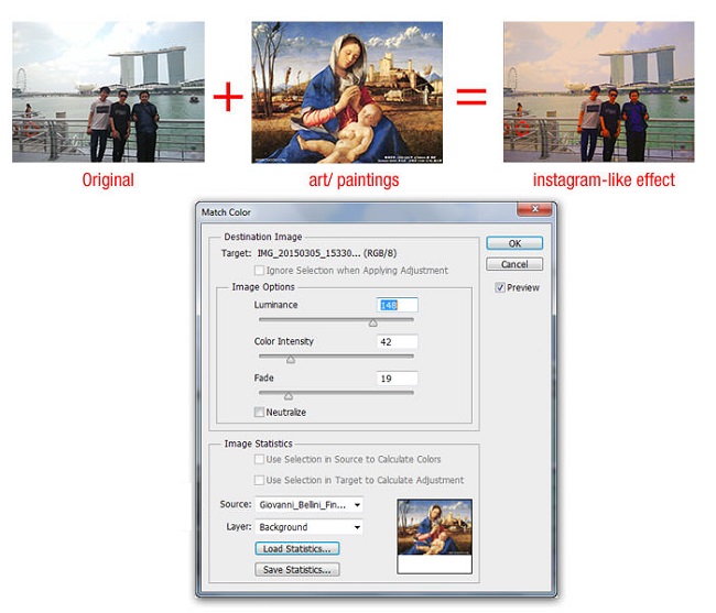Do you have a photo that is quite lackluster in color and want to change it to look more eye-catching but not too complicated? So, let’s immediately refer to how to create an extremely simple color effect as follows: Open the photo you want to edit, select Image > Adjustments > Match Color, then select the photo with the color palette you like. And click OK to see the changes. You can also adjust parameters in the Source section such as Luminance (color luminance) or Color Intensity (color intensity) to have a photo with more harmonious colors.