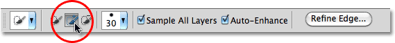 If you look at the Options bar at the top of the screen. You will now see a series of three icons that allow us to switch between the three selection modes of the tool. (from left to right – New selection. Add to selection and Subtract from selection). Depending on the requirements of the specific problem, we can choose the appropriate mode for the tool. Quick Selection